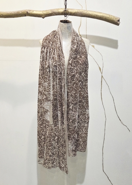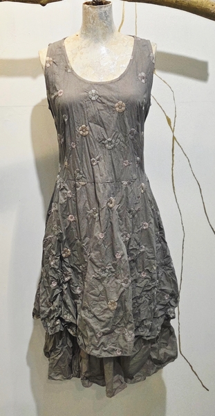 hier in einem wunderschön bestickten Blumenstoff in der farbe ASH. Die zauberhaften Blüten sind in graugrün und graustichigem rose entsprechend passend. Das Kleid ist figurbetont aber ein Schlupfkleid.