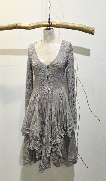 hier in der Farbe ASH....Das Oberteil des Mantels ist in elastischer, schmusiger Spitze gefertigt.... kleine Knöpfe bilden mit Schlaufen den Verschluss. Das Rockteil des Mantels ist zipfelig gefertigt, mit viel Volumen aus reiner Baumwolle