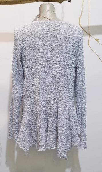 oben figurbetont und zum Saum hin an den Seiten leicht zipfelig. Ein wunderschönes Shirt aus einer herllich elastischen Spitze hier in zartgrau. Das Material haben wir in sehr vielen Farben. Das Shirt macht jedes Kleid, jeden Rock oder Hose zu einem Hingucker.
