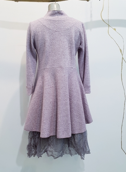hier in einem zartfliederfarbenen Walk. Wunderbar schmusig auf der Haut durch eine Zugabe von Viskose. Im Oberteil figurbetont und zum Saum hin durch ein weites Schößchen in das letzte Jahrhundert versetzt.