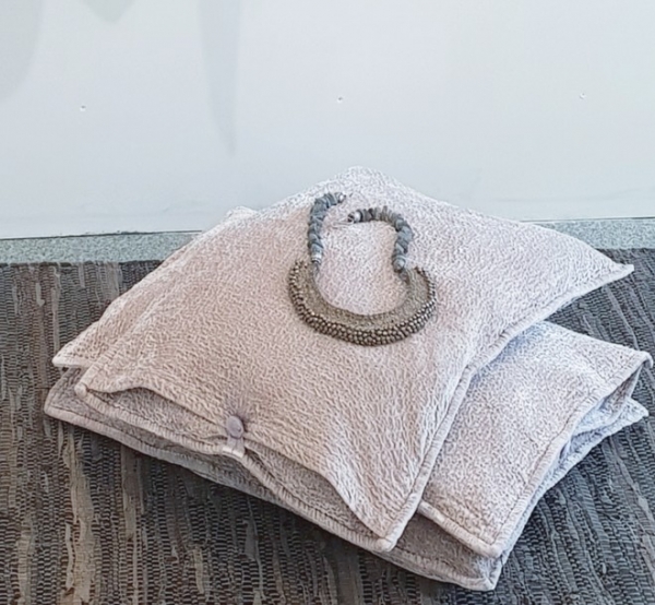 hier in perlmuttfarben. Seidensamt wurde auf Baumwolle gesteppt. Die Kissen sind 60 x 40 cm groß, werden ohne Füllung geliefert. Ich liebe diese Schmusekissen. Geschlossen durch einen Knopf