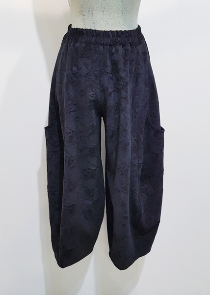 hier in schwarzen Feincord gecrashed..... Die Hose ist durch ihre Gummibundverarbeitung sehr bequem. Große Taschen an den Seiten sind der Hingucker dieser Hose. Der Schnitt ist leicht bauchig hin zum Saum. Das Material trägt sich super auf der Haut und ist pflegeleicht