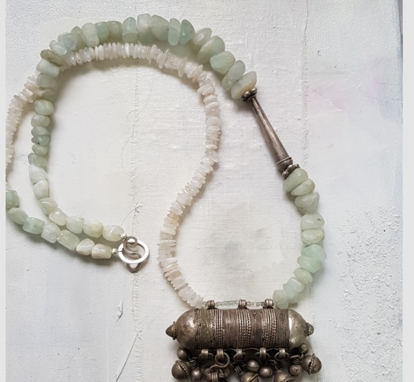 aus meiner Werkstatt....... da ich antike asiatische Elemente liebe, hier ein nepalesicher Silber HIrzmit weiteren Silberelementen, zartgrünen Aquamarinen und Mondsteinen....Ein Traumteil für Damen die außergewöhnlichen Schmuck lieben. Ein Statement- Schmuckstück.