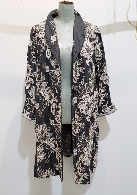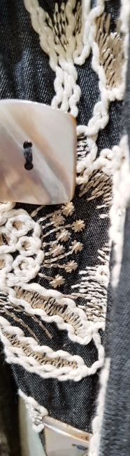 hier in einem anthrazithfarbenen Jeansgewebe gepaart mit einer herrlichen Stickerei aus Baumwolle..... Der Mantel ist ungefüttert !