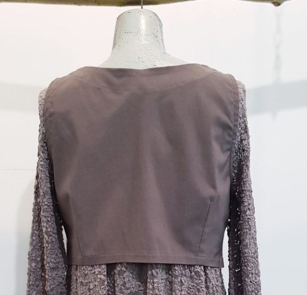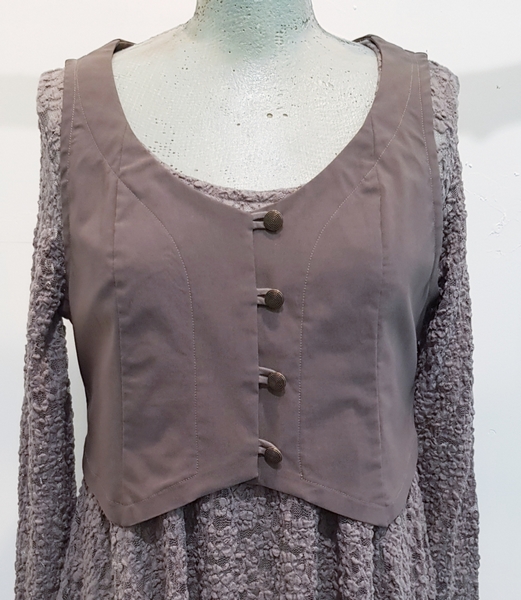 hier aus einem braunen elastischen Viskosegemisch. Eine wunderbare kleine Weste, mit der man Kleider und Blusen auf Figur bringt.