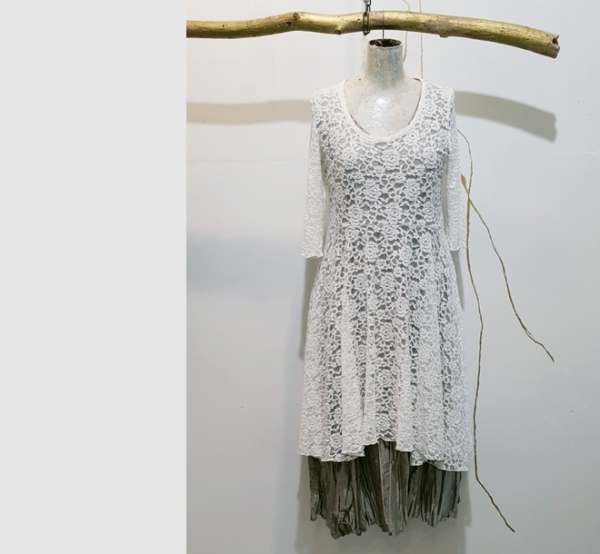hier in einem ecru mit einem 3/4 Arm geschnitten Eine figurbetonte Spitzentunika , zum Saum hin durch ein Schößchen wunderbar weit