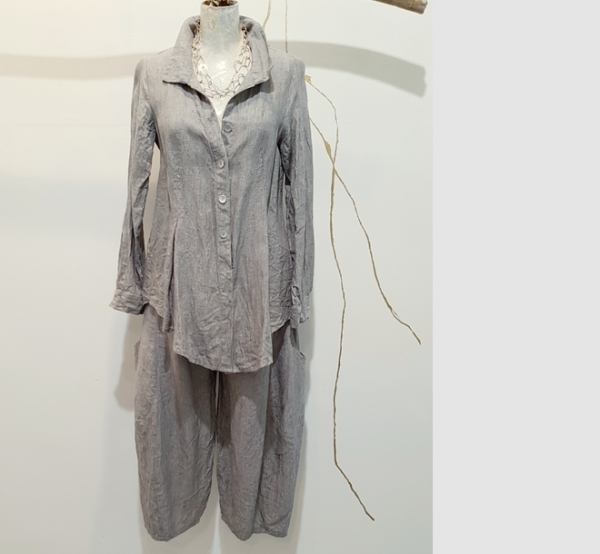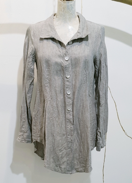 hier in einem sandfarbenen Leinen. Kleine Perlmuttknöpfe zieren die Knopfleiste.Die Bluse ist vorne kürzer als im Rückenteil.