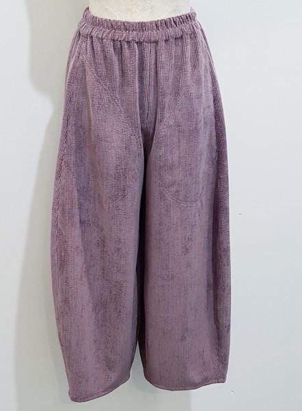 hier aus einem mauve farbenen Breitcord. Das Material ist super pflegeleicht und angenehm tragbar auf der Haut. Für die Bequemlichkeit haben wir die Hose mit Gummizug gearbeitet.