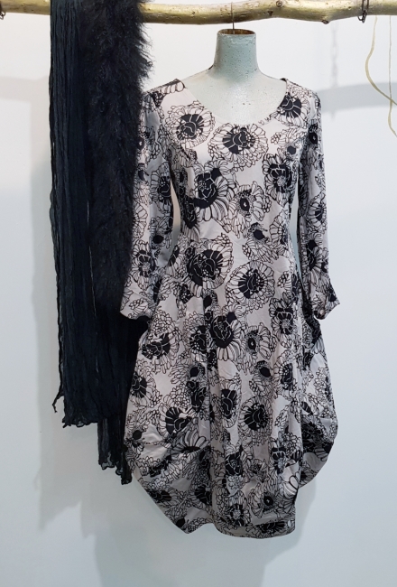 hier aus einem sehr aparten Baumwollstoff mit einem Hauch von Elasthan. Hellgrau trifft auf schwarze Blume..... das Material ist sehr angenehm auf der Haut. das Kleid ist mit einem langen geschlitzten Arm gefertigt. Im Oberteil figurbetont und zum Saum hin bauchig geschnitten. Große Taschen an den Seiten . Ein toller Schnitt für Frauen mit Hüftrundungen.