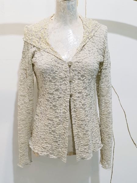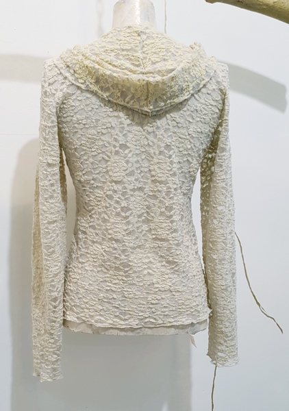hier in der Frabe gold...Verschluß über 3 kleine Knöpfe. Hingucker die Kapuze...Die Spitze ist wunderbar pflegeleicht und in vielen Farben erhältlich. Sprechen Sie uns gerne an wenn dieser Farbton der falsche ist.