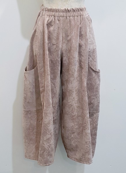 hier in einem Sandfarbenen Crashcord....unser Lieblingsmaterial im Winter. Für die Bequemlichkeit wurde die Hose mit Gummizug verarbeitet. Große Taschen zieren die Seiten. Super pflegeleicht !
