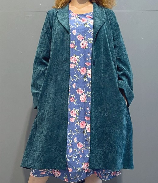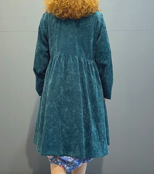 ein ungefütterter Mantel ( Blazerersatz ) in waldgrünem Cord. Das Material ist wunderschön im Fall und auf der Haut. Geschlossen wir er über Knöpfe. Der Hingucker ist das Schößchen im Rückenteil.