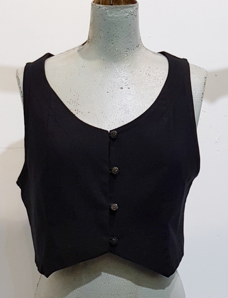 hier aus einem schwarzen elastischen Viskosegemisch. Eine wunderbare kleine Weste, mit der man Kleider und Blusen auf Figur bringt.