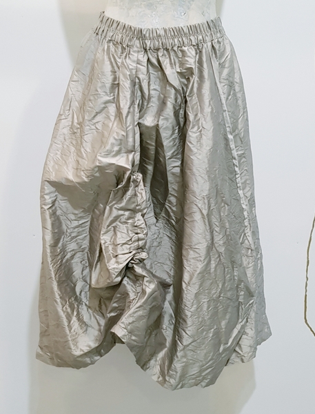 ein balloniger ,hell sandfarbener Seidenrock der durch Tunnelzug in der Naht vorne oder hinten gekürzt getragen werden kann. Für die Bequemlichkeit ist der Rock mit einem Gummibund verarbeitet.