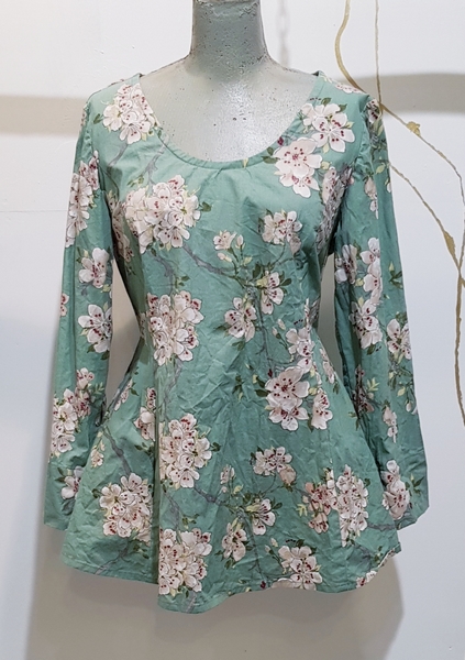 hier aus einer wunderschöne, blumigen Baumwolle. Das Material ist wunderbar auf der Haut und dadurch das es etwas dicker ist, ist es auch im Herbst Winter wärmend. Das Oberteil ist figurbetont geschnitten ( aber zum Schlupfen ) und zum Saum hin glockig, verdeckt somit immer die etwas ungliebeteren Zonen.