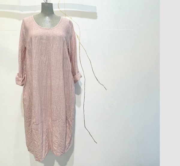 hier in einem wunderschönen zartpudrigem Leinen. Das Kleid ist mit einem 3/4 Arm gearbeitet. Es ist luftig geschnitten und leicht bauchig zum Saum hin. Ein tolles Sommerkleid