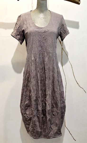 hier in einer Crashbaumwolle in der Farbe " ash " gefärbt. Dieser Ton passt hervorragend in unsere komplette Kollektion. Das Kleid ist figurbetont und zum Saum hin bauchig geschnitten und mit einem kurzen Arm versehen. Der Schnitt ist perfekt für Frauen, die etwas stärker in der Hüfte sind. das Material ist super angenehm auf der haut.