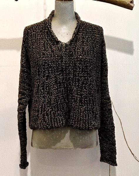 hier aus einem Bändchengarn aus einem Baumwollgemisch handgestrickt. Ich liebe diese Art von Pullis. Nicht zu lang und universell tragbar.