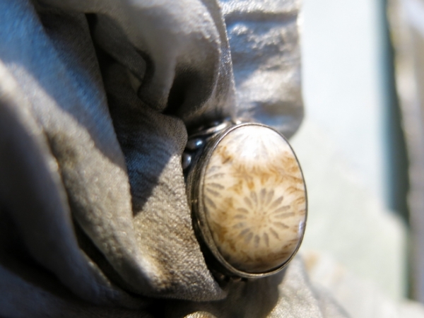 Es ist ein Silberring mit einer Korallenblüte in einem zarten beige. Es sieht aus wie eine zarte Zeichnung.