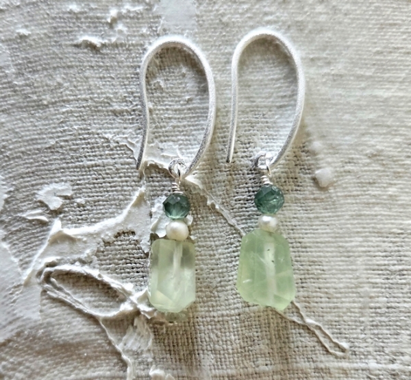 hier in Form einer Ohrschleife in gebürstetem Silbermit unterschiedlich geschliffenen Apathiten und kleiner Saatperle.