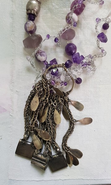 Collier in unterschiedlichen violett Tönen, helle Fluride, antike afrikanische Silberperlen und Stäbchen, sowie ein indischer Silberanhänger aus alter Zeit.....all diese Dinge habe ich zu einer wunderschönen Kette zusammengeführt.
