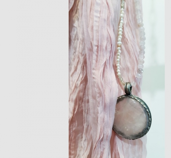 ein wunderschöner Hingucker auf dieser Kombination.....ein in Silber gefasster, geeister ( entsteht durch Kälte) Rosenquarz..... die Kälte läst ihn matt wirken. Sehr apart. das Collier besteht aus kleinen perlen, Mondsteinen und Rosenquarzen.