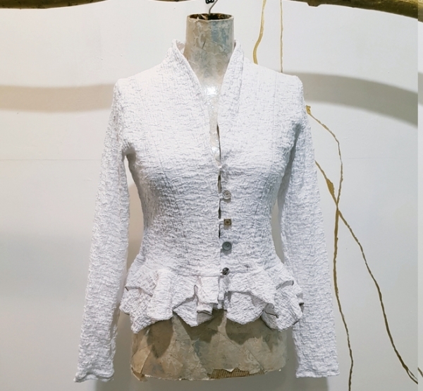 hier in einer hauchzarten Stretchbaumwolle in weiß, mit Cloqueoptik durch Stickerei mit einem elastischen Faden gepaart . Als Verschluss dienen unterschiedliche KnöpfchenHIngucker ist die Verarbeitung mit farbigem Garn in der Farbe taupe