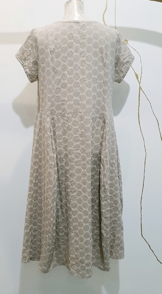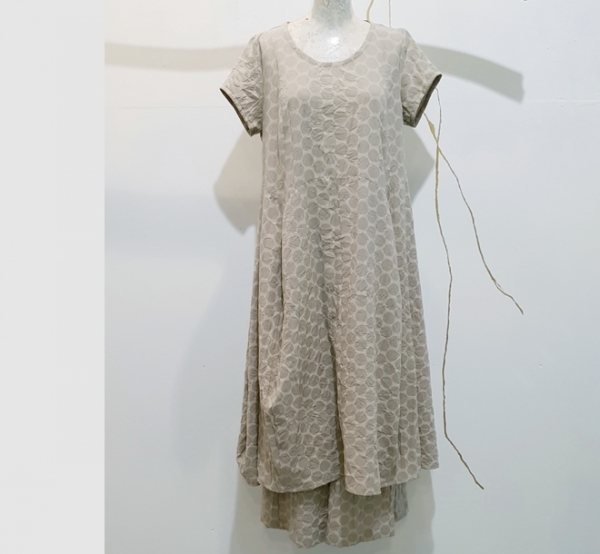 hier haben wir es als Tunika über die passende Hose fotografiert. Der Schnitt der Taille ist leicht abgerundet, zum Saum hin ballonig und macht eine wunderbare Figur. Das Material ist ein leichtgecrashtes Baumwollgemisch mit großen Punkten in unterschiedlichen Sandtönen