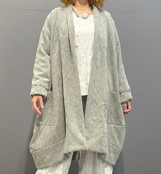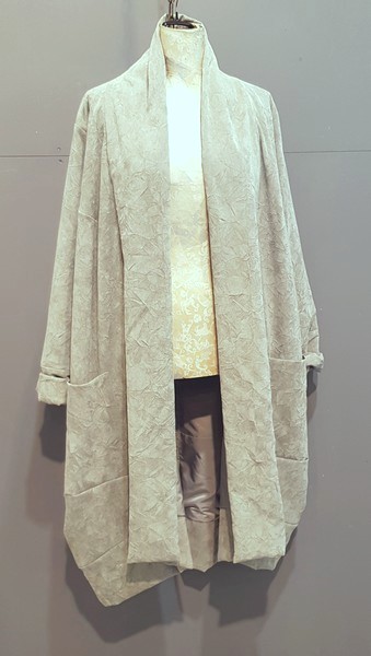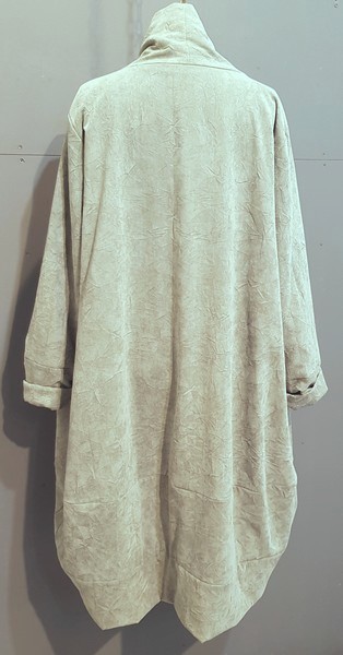 hier aus einem zarten lindgrünen Fein-Crashcord. Der Schitt erinnert an die 20 er Jahre des letzten Jahrhunderts. Kuschelig warm ist er durch 2 Lagen Wollflies, die auf eine Viskosefutter gearbeitet sind.. sehr aufwendig gearbeitet.