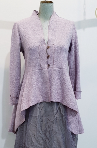 hier in einem zartfliederfarbenen Walk. Wunderbar schmusig auf der Haut durch eine Zugabe von Viskose. Im Oberteil figurbetont und zum Saum hin durch ein weites Schößchen in das letzte Jahrhundert versetzt.