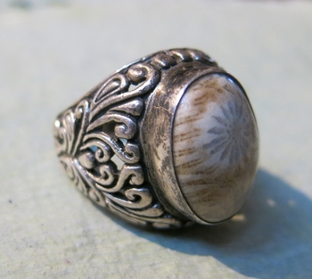 das gefasste Material entzieht sich meines Wissens, aber wir vermuten eine Korallenblüte.