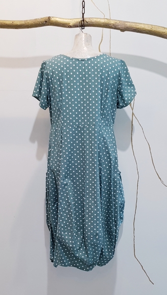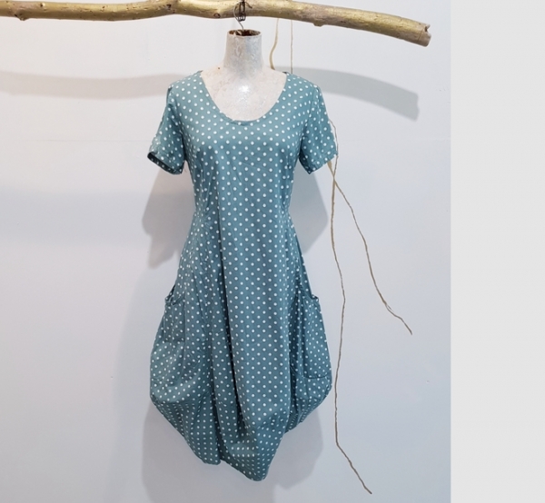 hier in gepunkteter Baumwolle mit kurzem Arm gearbeitet. Figurbetont im Oberteil, schmal in der Taille und bauchig zum Saum hin.Hingucker des Kleides sind die seitlichen großen Taschen