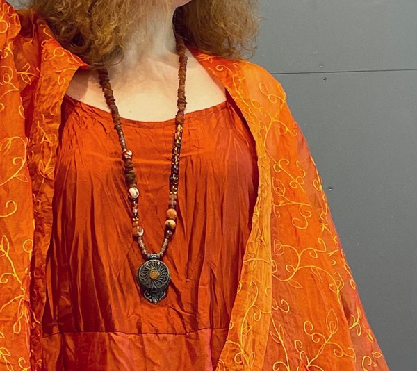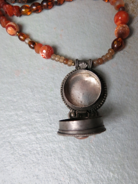 Der Anhänger ist eine keiner Gau aus filigranem Silber mit einem Karneol. Diese Box ist für kleine Geheimnisse gefertigt.