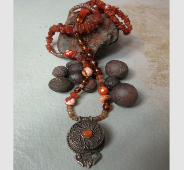 Schmückendes: KARNEOLE; BERNSTEIN und braune MONDSTEINE