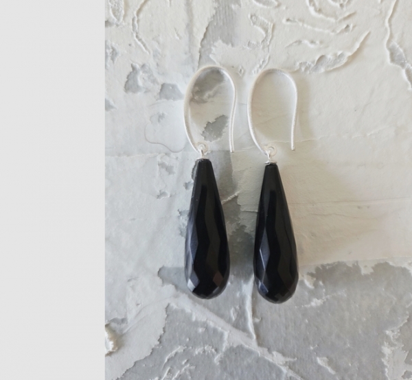 hier eine Ohrschleide in gebürstetem Silber mit einem langen faccetiertem Onyx in Kegelform. Onyx entsteht in Hohlräumen von Vulkanen und steht für innere Ballence, Stärke und Schutz. Ein Traumteil an Ohrgeschmeide