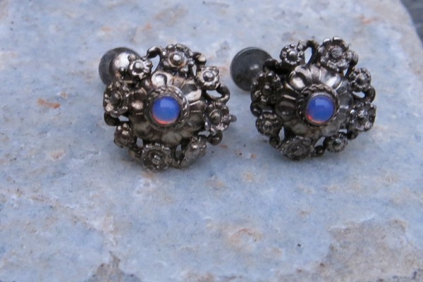 In der Mitte thront ein kleiner blauschimmernder Opal ...je nach Lichteinfall kann er auch in orange,lilatönen schimmern....wunderschon . Dieses Kleinod ist sehr aufwendig gearbeitet worden. Stammt aus den 40er/50er Jahren.