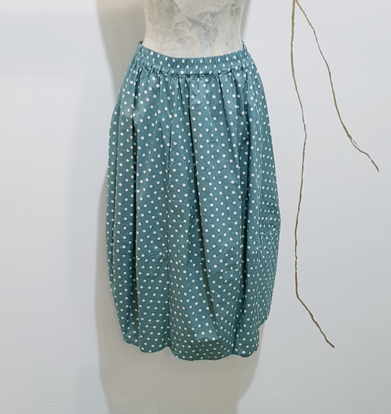 hier in einem unserer Liebling Sommerstoffe. Mint mit weißen Punkten aus Baumwolle....super pflegeleicht und herrlich im Tragecomfort duch Gummibundverarbeitung. Der Rock schmeichelt der Figur durch den bauchigen Schnitt, ist aber sonst sehr puristisch. Taschen in den Nähten, somit nicht sichtbar