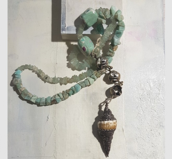 aus Amazonit, Aquamarin, Amazonit mit Rubineinschlüssen, hangeschmiedeten Silberelementen sowie einer sehr alten Schnecke in Silber geformt und herrlich ausgearbeitet.