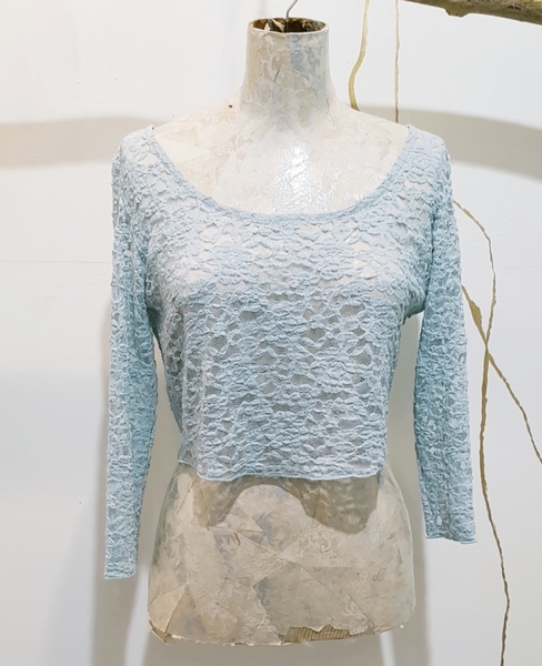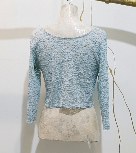 hier in der Farbe Teal.....hier mit einem 3 /4 Arm. Das Oberteil endet je nach Brustgröße direkt unterhalb des Busens oder tiefer in der Taille.Wir färben diese Spitze in unsere Kollektionen. Somit gibt es das Oberteil in vielen Farben. Sprechen Sie uns gerne an.