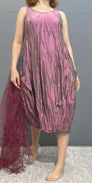 hier aus einer pink changierenden Seide. Leider haben wir von dieser außergewöhnlichen Farbe nicht all zu viel kaufen können. Sie wird nur noch in großen Mengen abgegeben und somit nicht mehr erschwinglich für unsere Art der Arbeit. Es ist eine super schöne Farbe und mit vielen anderen Nuancen kombinierbar