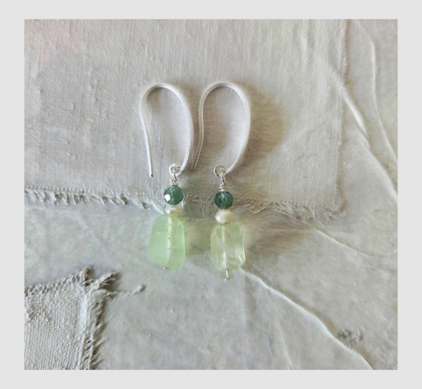 hier in Form einer Ohrschleife in gebürstetem Silbermit unterschiedlich geschliffenen Apathiten und kleiner Saatperle.