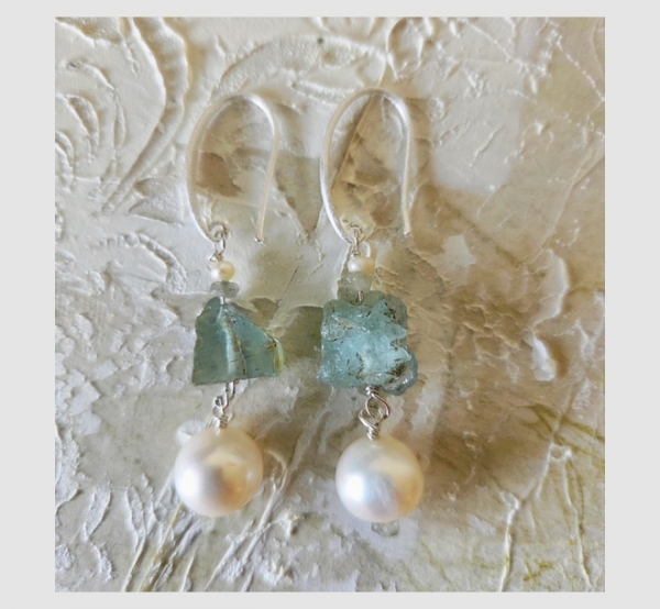 hier in gebürstetem Silber mit naturbelassenenAquamarinkristallen, einer großen und kleinen Perle und kleinen Aquamarin Rondellen.