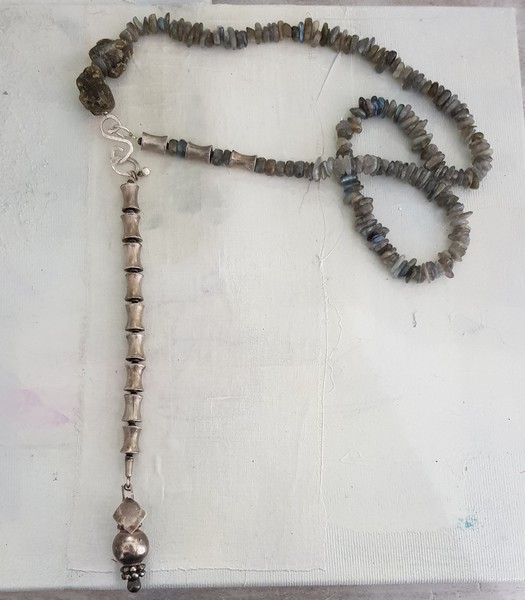 aus meiner Silberschmiede in unterschiedlichen Schliffen sowie alte Silberperlen habe ich hier gepaart. Die Silber-Elemnte stammen aus Afrika und Nepal. Der lange Anhänger ist abnehmbar.