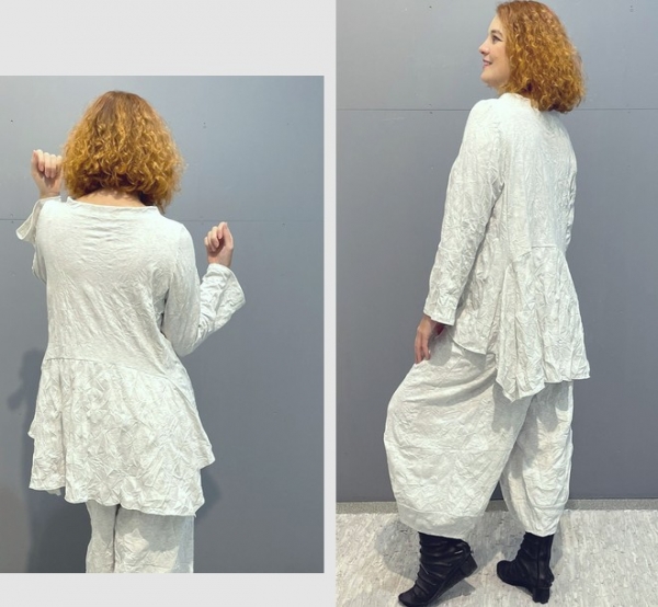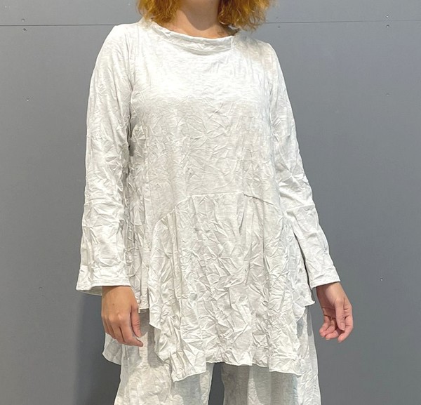 aus unserem Lieblingsmaterial Crashjersey hier mit kurzem Arm.. Hier in kühlem Natur melliert. Ein tolles Material. Wunderbar auf der Haut und super pflegeleicht. Der Schnitt ist zipfelig durch ein Schösschen. Hingucker ist auch die Halsausschnittverarbeitung. Ein Teil das zu allem passt