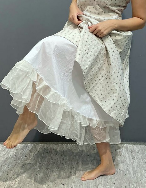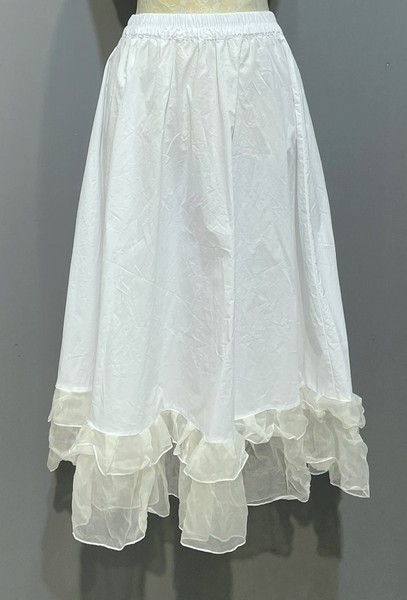 hier haben wir als Unterrock mißbraucht. Er ist aber auch als seperater Rock zu benutzen. Er ist aus einer fast blickdichten Baumwolle gearbeitet.Unen am Saum der Hingucker aus Seidenorganza