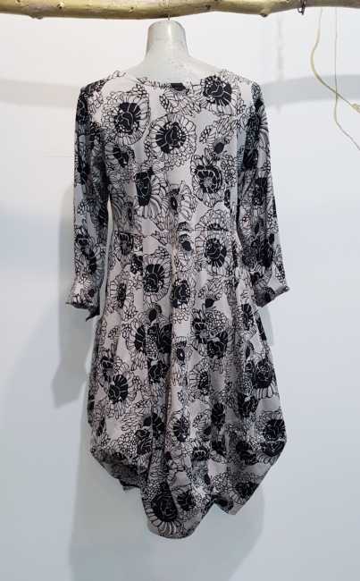 hier aus einem sehr aparten Baumwollstoff mit einem Hauch von Elasthan. Hellgrau trifft auf schwarze Blume..... das Material ist sehr angenehm auf der Haut. das Kleid ist mit einem langen geschlitzten Arm gefertigt. Im Oberteil figurbetont und zum Saum hin bauchig geschnitten. Große Taschen an den Seiten . Ein toller Schnitt für Frauen mit Hüftrundungen.