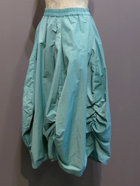 er ist mit einem Gummibund gearbeitet und man kann ihn durch Bindebänder im Rockinneren auf unterschiedliche Höhen drapieren...oder auch gar nicht