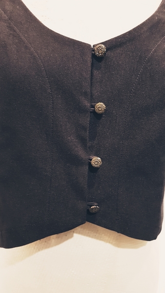 hier aus einem schwarzen elastischen Viskosegemisch. Eine wunderbare kleine Weste, mit der man Kleider und Blusen auf Figur bringt.