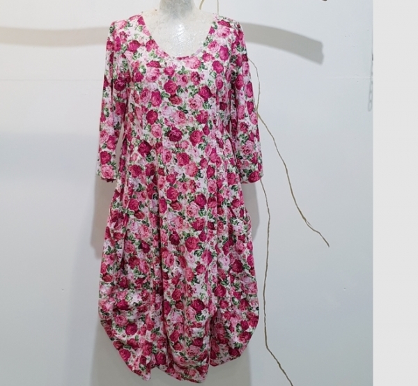 hier in einer wunderschönen Baumwolle mit pinkfarbenem Rosenmuster. IN diesem Fall it einem 3/4 langem Aufschlagärmel gefertigt. Ein Lieblingsteil. Der Schitt ist im Oberteil Figurbetont und zum Saum hin bauchig geformt. Hingucker sind die großen Taschen an der Seite.