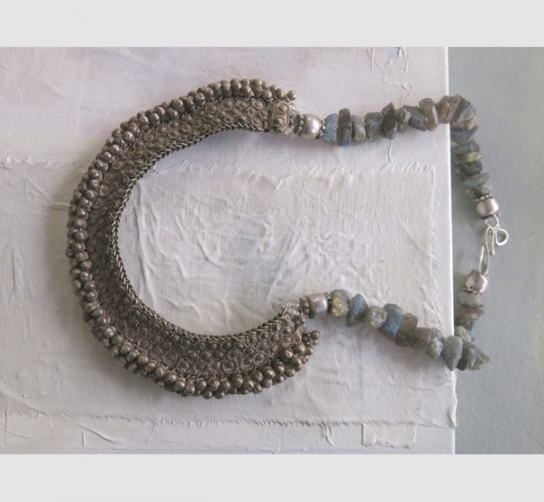 Diese wunderschöne, antike handgschmiedete indische Silberarbeit habe ich als Hingucker dieser Kette benutzt. Sie ist aus meiner Sammlung orientalischen Schmuckes aus dem alten Indien. Als Alter hat man mir den Anfang des letzten Jahrhunderts benannt. Diesem Amulett habe ich grobe fast ungeschliffene Labradorite beigefügt und antike afrikanische Silberperlen. Der Verschluss ist aus meiner eigenen Silberschmiede. Den Silbergehalt des Anklett und der Perlen kann ich leider nicht exakt bestimmen. Ich vermute, dass er niedrig ist wie die meisten Silberarbeiten des Orients. Der Verschluss ist aus 925 Silber.